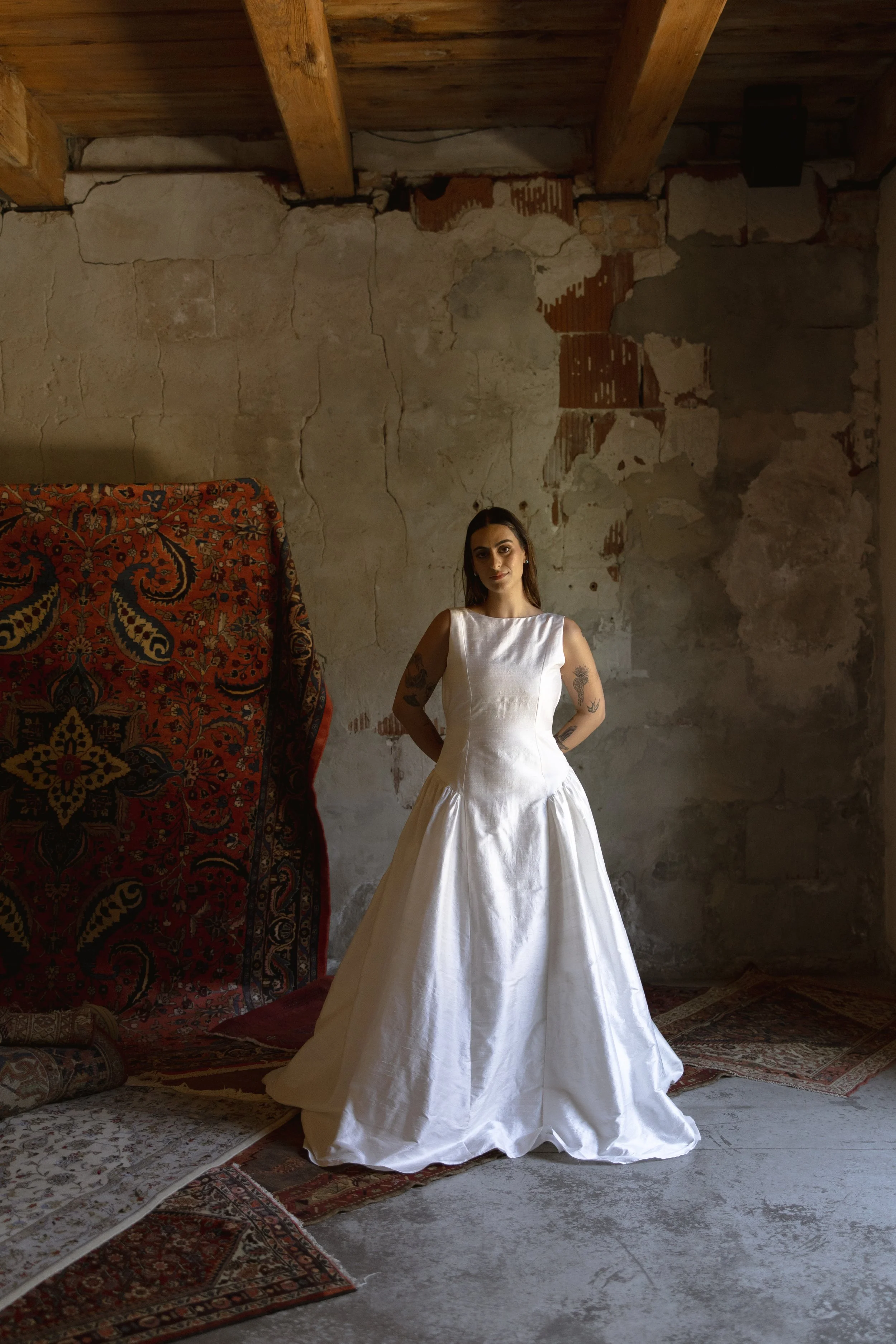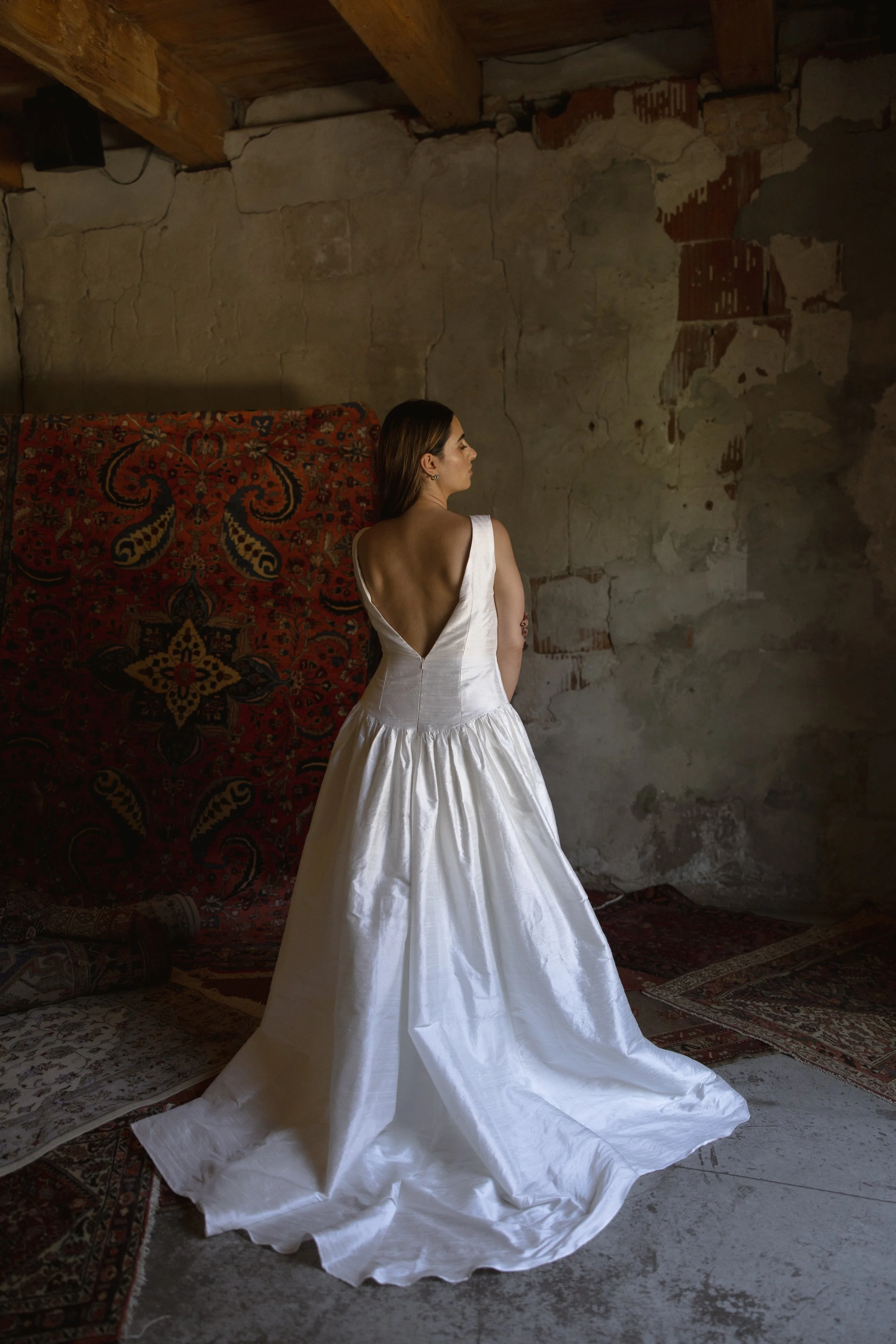 The Mosaic Corset is a statement in craftsmanship and conscious design. Featuring a cat-eye neckline and structured silhouette, this corset is made from a low-waste patchwork textile created entirely from off-cuts of the current collection. Each piece is meticulously composed, transforming production remnants into an artful, one-of-a-kind fabric. The result is a sculptural, sustainable corset that celebrates both form and responsibility — embodying the beauty of intentional design.